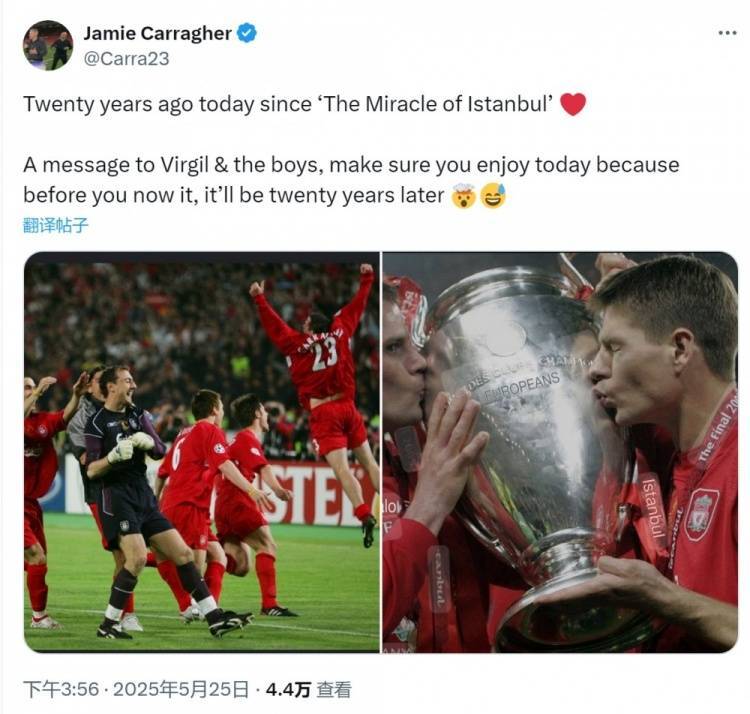 卡拉格社媒晒出当时的照片,并写道:“今天是‘伊斯坦布尔奇迹’二十周年纪念日。”